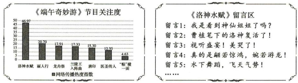 (2)示例:同学们,《洛神水赋》是《端午奇妙游》的开场节目,堪称视听盛宴,在整台节目中网络传播热度指数遥遥领先,网上评价很高,大家一定要看看!
