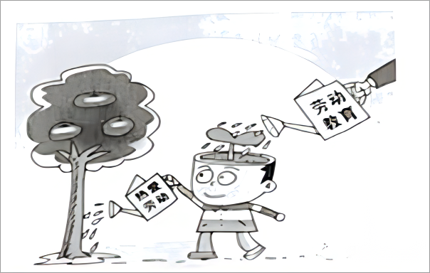 22、示例:漫画内容:背景是一轮太阳,约占画面的四分之三;主体画面:右侧上方一只手握着一把写有“劳动教育”的喷壶,喷壶成45度角倾斜,壶嘴喷洒的水滴,正浇灌在中间的人物头上,中间是一个学生模样的人,人头顶部大脑部分是正在接受喷壶浇灌的一株有两片叶片的幼芽,他的右手向后伸展,显出努力的样子,左手拿着一把写有“热爱劳动”的喷壶,正在浇灌前方的一颗树;左侧是一株大树,树的下面是学生喷洒的水迹,树身笔直挺拔,树冠是幻化的三张人脸,张着嘴,似乎很快乐。寓意:经过劳动教育,孩子们热爱劳动。