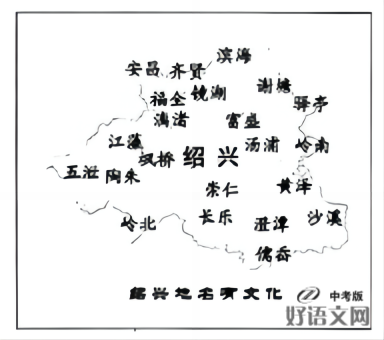 小明:看我做的《绍兴地名有文化》(上图),有发现吗?有些地方以地理特征命名。近水之地,如“① 、 ”等,地名就含与水有关的字。