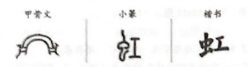 古人看见时隐时现的虹桥,于是浮想联piān( ),把它看作有灵性的龙蛇类的神物,能够低头喝河水。有人把它描述成两边各有一个头的神兽。“虹”字最原始的写法就是对这种神兽形象的描绘。后来,人们才把它改成了更容易读写的形声字,用“工”旁表音,用“虫”旁表意。