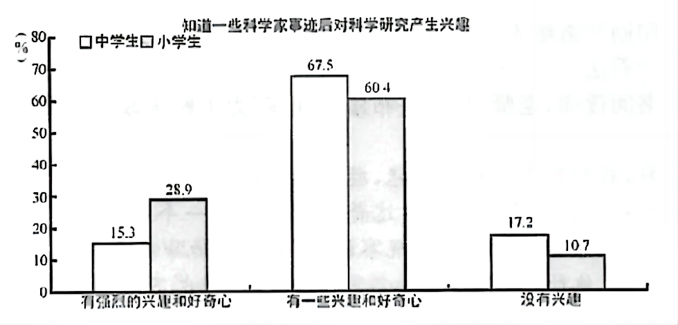 B.在知道一些科学家的事迹后,17.2%的中学生和10.7%的小学生都表示没有兴趣,说明中小学生已经对科学研究失去了好奇心。