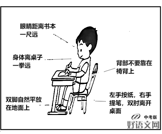 3、【辨析】下图是某校学生写字坐姿示意图,图中文字说明与材料一中的表述有一处矛盾,请指出,并结合你的生活体验说明矛盾的原因。(4分)