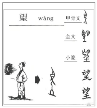 ①甲骨文“望”字,像一个人站在地上,睁大眼睛远眺。金文加上了“月”形,更明显地表达了“远望”的意思。发展至小篆,“望”的字形基本确定。