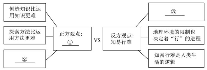 ⑤综上所述,知是一个艰难曲折的过程,它需要“天将降大任于是人”的责任感,需要“吾将上下而求索”的勇气,更需要“众里寻他千百度”的毅力。因此我方认为知难行易!
