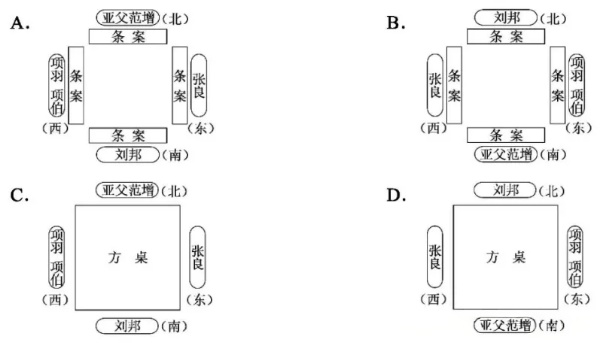 17、关于《史记》鸿门宴的座次安排,下列四图所示正确的一项是( )(2分)